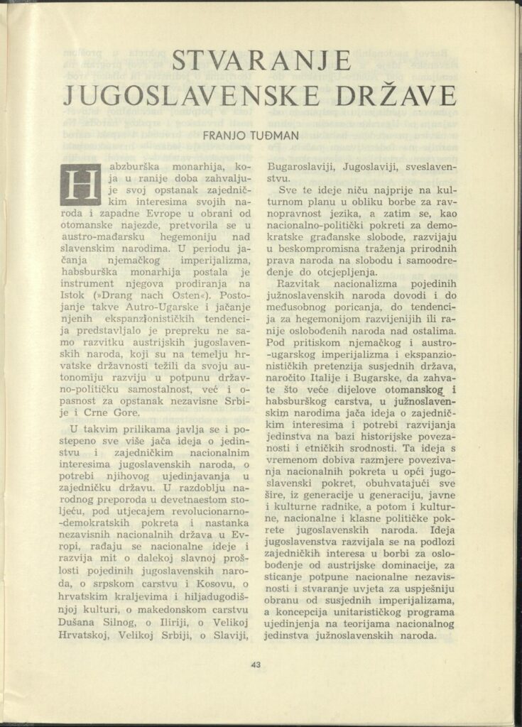 Tuđman je u tome prvome mandatnom razdoblju napisao i članak za Matičin godišnjak Iseljenički kalendar za 1965. godinu, pod naslovom „Stvaranje jugoslavenske države“, koji je izazvao rasprave u tadašnjim političkim krugovima. Sporan je bio zadnji dio članka u kojemu je Tuđman kritizirao nastanak Kraljevine Srba, Hrvata i Slovenaca 1918. naglasivši kako ujedinjenje nije bilo rezultat promišljenog dogovora niti demokratski provedenog sporazuma, nego je bilo rezultat nametanja „hegemonije srpske buržoazije“. Nametanje hegemonije poistovjetio je s unitarističko-centralističkom koncepcijom nove države i idejom integralnog jugoslavenstva za koju, po njemu, nisu postojali povijesni, nacionalno-politički i ekonomsko-kulturni preduvjeti. S obzirom na aktualnost tih zaključaka i u vrijeme kada je tekst tiskan, pojedinci iz Matice žalili su se sekretaru Centralnog komiteta Saveza komunista Hrvatske (CK SKH), koji je rekao da takvi stavovi nisu prihvatljivi i da treba paziti da ne dospiju u javnost. No, unatoč tome ti zaključci su ipak dospjeli u javnost jer je Matičin Iseljenički kalendar distribuiran po cijelome svijetu u sredinama gdje žive hrvatski iseljenici.