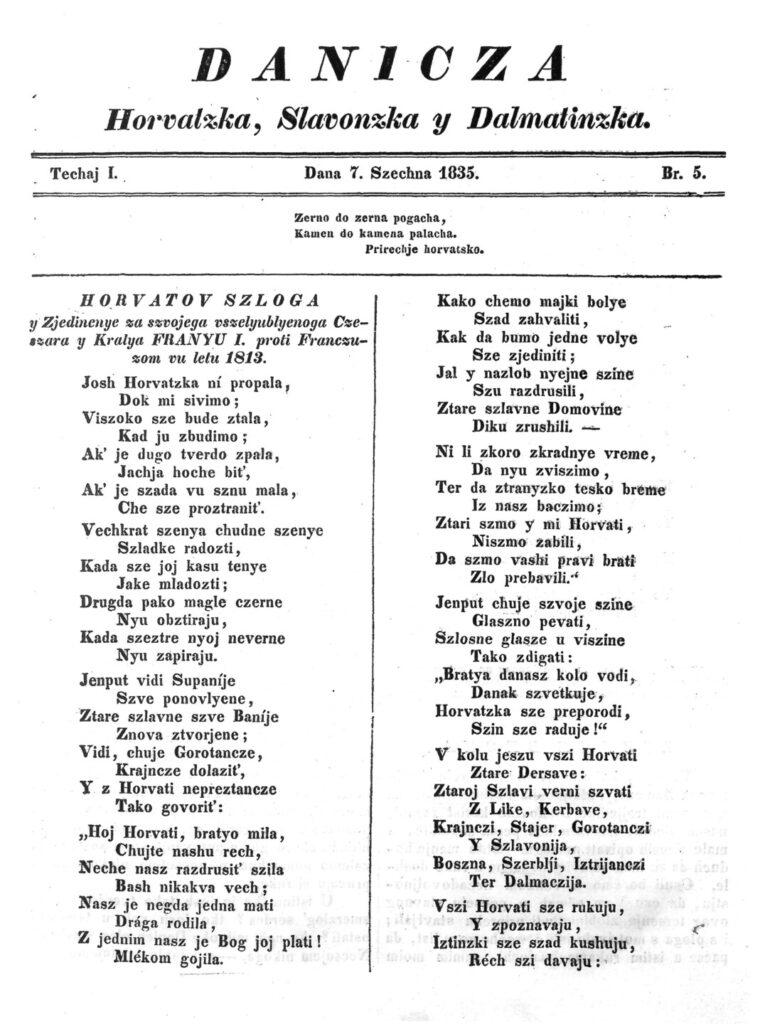 A sve je započelo prije 190 godina kad je prvi put izvedena prva hrvatska domoljubna pjesma, točnije budnica, Još Hrvatska ni propala čiji tekst je napisao vođa hrvatskoga narodnog preporoda Ljudevit Gaj, a glazbu skladao Ferdo Livadić. Ova pjesma stekla je golemu popularnost i postala simbol cijeloga jednog razdoblja kada se intenzivirao proces stvaranja moderne hrvatske nacije i njezinih institucija, uz standardiziranje hrvatskoga jezika i pravopisa i svekoliki razvoj kulturnoga života. Zbog poticajnoga nacionalno-političkog sadržaja, jednostavne i poletne melodije i živog ritma postala je uzor za stotinjak budnica koje su do 1848. nastajale u svim hrvatskim zemljama. Još Hrvatska ni propala prvi put je javno izvedena 7. veljače 1835. u Zagrebu i postala je neslužbenom himnom hrvatskoga preporodnog pokreta, svojevrsna hrvatska Marseljeza. Bilo je to mjesec dana nakon što je Gaj 6. siječnja 1835. počeo dvaput tjedno izdavati svoje Novine Horvatzke s književnim prilogom Danicza Horvatzka, slavonzka y Dalmatinzka, prve novine u potpunosti na hrvatskome jeziku i to na kajkavštini (od 1836. na štokavštini pod nazivom Ilirske narodne novine s prilogom Danica Ilirska), što se smatra početkom središnjeg razdoblja hrvatskoga narodnog preporoda. U to vrijeme u Hrvatskoj je na scenu stupila mlada građanska generacija predvođena Ljudevitom Gajem koja će zajedno s dijelom plemstva povesti sustavno organiziranu preporodnu djelatnost zasnovanu na nacionalnoj ideji i započeti proces hrvatske nacionalne integracije. Gaj je zamislio da će se hrvatske zemlje ujediniti preko zamišljenoga jedinstvenog jezika za sve Južne Slavene, a prvi korak trebao je biti pravopis. Gaj je 1830. objavio svoj prijedlog reforme hrvatskoga pravopisa nazvan Kratka osnova horvatsko-slavenskog pravopisanja, čime je postao pokretač dotad nekoordiniranih preporodnih aktivnosti u Hrvatskoj. Stoga ne treba čuditi zašto Gajeva pjesma Još Hrvatska ni propala zrači optimizmom i izražava samosvijest njegove generacije da će uspjeti dovesti Hrvate do svijesti o vlastitoj samosvojnosti i individualnosti uz izgradnju novih kulturnih vrijednosti.