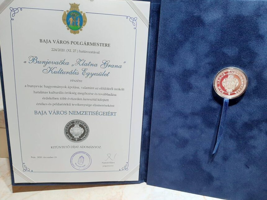Entre los premiados se encuentra la Asociación cultural de los Bunjevci „Zlatna grana“, que recibió el Premio a las nacionalidades de la ciudad de Baja“ en reconocimento a „décadas de actividad ejemplar y valiosa y compromiso de nutrir las tradiciones de los Bunjevci, preservando y transmitiendo el rico patrimonio cultural heredado de sus antepasados“. El premio fue recibido por la vicepresidente y miembro de la Asociación cultural y artística Noémi Páli.