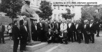 SPOMENIK MARKU MARULIĆU U BERLINU - Ispred Gradske vijećnice berlinske općine Wilmersdorf, 27. svibnja, svečano je otkriven spomenik Marku Maruliću, ocu hrvatske književnosti, rad uglednog hrvatskog kipara Slavomira Drinkovića. Tako je u njemačkoj metropoli obilježena 550. obljetnica Marulićeva rođenja i 30. obljetnica suradnje njegova rodnog grada Splita i Wilmersdorfa. U taj značajan kulturni projekt bili su uključeni, uz dva grada, još Ministarstvo kulture Republike Hrvatske i Hrvati koji žive u Berlinu. Na svečanom otkrivanju spomenika govorio je naš poznati marulolog, dr. Mirko Tomasović. ZAGREBAČKI HOMMAGE GLASOVITOM GLAZBENIKU - Povodom 75. rođendana jednog od najvećih hrvatskih skladatelja 20. stoljeća Ive Maleca, koji puna tri desetljeća živi i stvara u Parizu, u Zagrebu je održan proošloga tjedna svečani koncert, kojim je u prvom dijelu osobno ravnao sam slavljenik. Naime, točno na njegov 75. rođendan, 30. ožujka, Ivo Malec u Velikoj je dvorani "Vatroslav Lisinski" ravnao Simfonijskim orkestrom Hrvatske Radiotelevizije, koji je u okviru Majstorskog ciklusa HRT i KDZ, između ostalog, izveo Malecove skladbe "Sonoris causa" i "Vox vocis". Hrvatskom skladatelju orkestralne, vokalne, komorne, elektroakustičke i scenske glazbe - čiji je opus stvaran uglavnom izvan domovine - ovom se prigodom u domovini i rodnome gradu pružio dostojan hommage. U drugom dijelu koncerta Simfonijski orkestar HRT izveo je "Posvećenje proljeća" Igora Stravinskog pod ravnanjem Nikše Bareze. Ivo Malec rođen je u Zagrebu 1925. Studirao je na Muzičkoj akademiji rodnoga grada. Imao je glasovite učitelje: skladatelja Mila Cipru iz kompozicije i velikog majstora Friedricha Zauna iz dirigiranja. Dobitnik je Nagrade grada Zagreba (1957.). U Francusku odlazi 1955. U Parizu se usavršavao kod velikana suvremene glazbe Oliviera Messiaena.To je bilo vrijeme, bilježe glazbeni kroničari, buđenja nove Pariške škole, kojoj će on biti jedan od najsjajnijih predstavnika. Susreti s pariškim glazbenicima, od kojih je najvažniji onaj s Pierrom Schaefferom, bili su vrlo poticajni za inventivne moći Ive Maleca. Od 1972. do 1990. u Parizu skladatelj Ivo Malec djeluje kao profesor kompozicije na Višem nacionalnom konzervatoriju glazbe. Malec je u Parizu čak pet puta primio prestižni Grand Prix du Disque, zatim Grand Prix de la Sacem te 1992. Grand Prix National de la Musique. Malecova glazba, ocjenjuju glazbeni kritičari, otvara vidike 21. stoljeća, već tako reći od svojih početaka. Malecova djela danas izvode ugledni svjetski orkestri i solisti te festivali u Europi i izvan nje. GODINA MARKA MARULIĆA - U godini proslave 550. obljetnice rođenja Marka Marulića, koju je Republika Hrvatska proglasila godinom spomena na 'oca hrvatske književnosti', tiskana je u travnju u Madridu na španjolskom jeziku - nakon nekoliko stoljeća od ranijih prijevoda Marulićevih djela - knjiga o Marku Maruliću autora mr. Bratislava Lučina. Tamošnji nakladnik Ediciones Clasicas objavio je u nizu Humanistička knjižnica (urednik Tomas Gonzalez Rolan) knjigu od stotinjak stranica, posvećenu 'ocu hrvatske književnosti'. Španjolsko izdanje knjige i većinu prijevoda potpisuje, uz autora Bratislava Lučina, Francisco Javier Juez Galvez. Edicija je brižno stručno i grafički opremljena, tako da čitateljima jednoga od najraširenijih svjetskih jezika dostojno i primjereno predstavlja hrvatskoga klasika. Štoviše, ona nastavlja prekinutu tradiciju španjolskih prijevoda Marulićevih djela iz XVI. i XVII. stoljeća te, istodobno, potiče njihovo proučavanje u iberijskim zemljama, gdje su ih nekada puno čitali i cijenili znameniti klasici poput Francisca de Queveda i Luisa de Granada. Dvijetisućita - godina Marka Marulića - obiluje nizom nakladničkih iznenađenja u Hrvatskoj i inozemstvu. Uz ovo španjolsko izdanje osobito su zanimljiva tri izdanja posvećena "ocu hrvatske književnosti" u nakladi domaćih nakladnika. Prvo, zbornik "Colloquia maruliana" u kojem su tiskani radovi sa znanstvenoga skupa "Marko Marulic, hrvatski pjesnik i katolički humanist" u nakladi Splitskog književnog kruga. Drugo izdanje je priredio zagrebački nakladnik "Konzor" u ediciji "Marko Marulić: Antologija" koju je priredio Mirko Tomasović. Treće izdanje je priredilo Društvo hrvatskih književnika koje je u Marulovoj godini čitatelje obradovalo posebnim brojem časopisa "Most/The Bridge" u kojem su na engleskom objavljeni tekstovi poznatih hrvatskih i inozemnih marulologa. Aktualnost Marulićeva djela pola tisućljeća nadahnjuje temelje europske kulture, objašnjava nam glasoviti marulolog dr. Mirko Tomasović. Naime, prinos marulologiji u posljednje doba dali su španjolski znanstvenici Rosa Maria Marina Saez, Jesus Lopez-Gay i Javier Galvez. Recepcijom našeg humanista u Španjolskoj pozabavio se i hrvatski hispanist Karlo Budor, njegov odjek u misijskim zemljama istražuje prof. Lopez-Gay, dok je prof. Marina Saez u dvjema studijama usredotočila svoju pozornost na metričke i stilske pojave u epu Davidias, kaže dr. Tomasović. Marko je Marulić, dodaje Tomasović, uveden u proučavateljski krug europskog humanizma i sa španjolske strane, što je zacijelo pripomoglo tiskanju ove knjige i što će, pretpostaviti je, uslijediti s daljnjom internacionalizacijom "oca hrvatske književnosti". Velike pak zasluge za Marulićevo valjano predstavljanje španjolskoj javnosti pripadaju i Lučinovu suradniku, prevoditelju većine latinskih tekstova te onih iz Judite, prof. Javieru Galvezu, koji je s pravom uživljenošću u Marulićev literarni svijet slijedio njegov rukopis i iskazao pravo prevoditeljsko umijeće, posebno u prijenosu pjesničkoga sloga Davidijade i Judite, objašnjava Tomasović. Dobro je postupio što je za ulomke iz Evangelistara i Parabola odabrao španjolski prijevod iz 1655., a za Marulićevu čuvenu pjesmu Carmen de doctrina Domini nostri Jesu Christi prepjev glasovitog Luisa de Granada