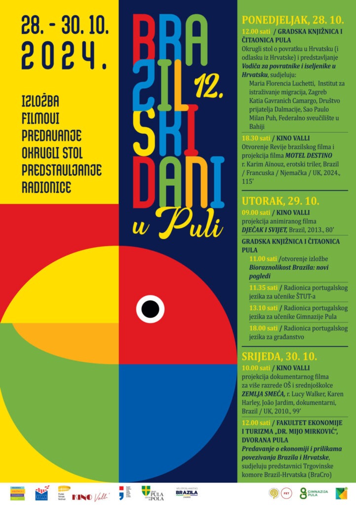Projekcija nagrađivanog animiranog filma Dječak i svijet koji prikazuje čaroban pogled na Brazil kroz oči jednog dječaka, uz jedinstvenu umjetničku tehniku i emotivnu priču održat će se u Kinu Valli, u utorak, 29. listopada u 9 sati. U 11 sati u izložbenom prostoru Gradske knjižnice i čitaonice Pula bit će otvorena izložba Bioraznolikost Brazila: novi pogledi autora Patricka Castilha dos Santosa koja donosi nove prizore brazilskih ekosustava, ističući raznolikost biljnog i životinjskog svijeta, kao i izazove očuvanja prirode. Nakon izložbe, na rasporedu su radionice osnova portugalskog jezika za učenike Škole za turizam, ugostiteljstvo i trgovinu te Gimnazije Pula, dok će u 18 sati biti održana radionica za zainteresirane građane tijekom koje će imati prigodu upoznati osnove portugalskog jezika putem postavljene izložbe.