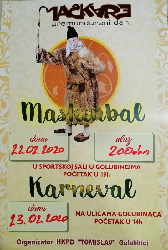 Golubinačke mačkare, koje organizira Hrvatsko kulturno prosvjetno društvo Tomislav, bit će održane od 21. do 24. veljače. Natjecateljsko-glazbeni program bit će održan 22. veljače u Sportskoj dvorani u Golubincima, kada će se birati najbolje maske, a u revijalnom dijelu programu će sudjelovati TS Ladan špricer, TO Vila iz Novog Sada i plesna škola Fenix iz Osijeka. Karneval na ulicama Golubinaca bit će održan 23. veljače s početkom u 14 sati.