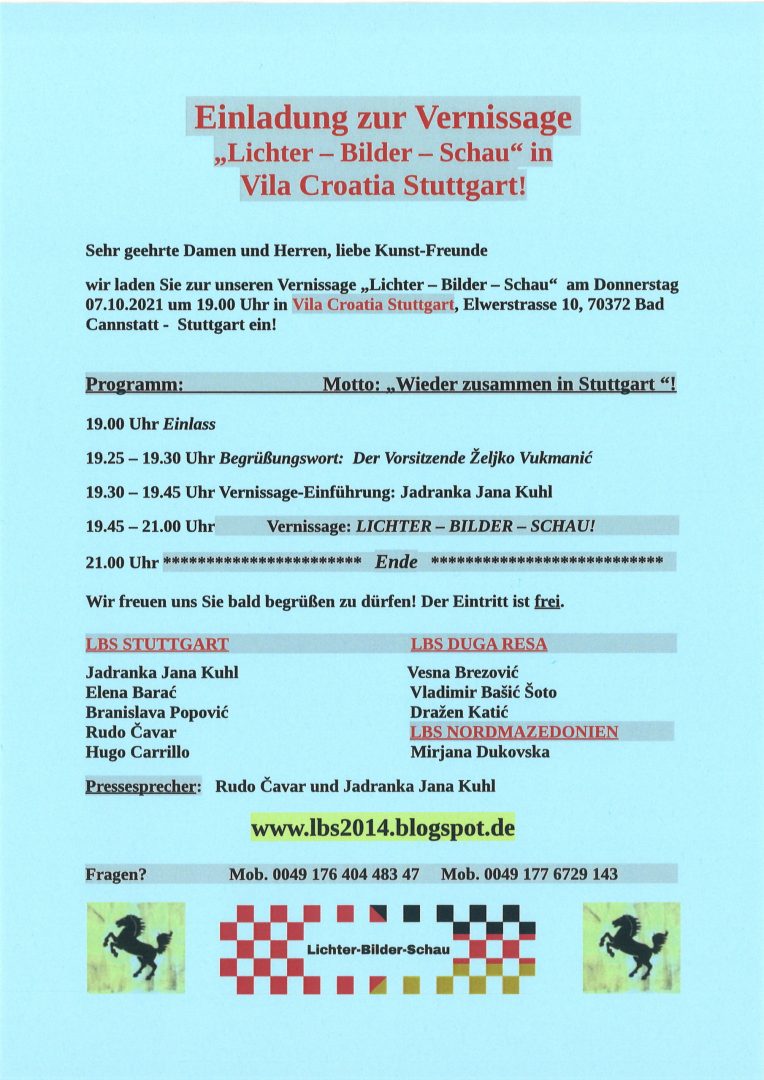 U četvrtak, 7 listopada je svečano predstavljanje izložbe “Lichter-Bilder-Schau” u Stuttgartu. Otvara se u 19 sati u Vila Croatia Stuttgart, na adresi Elverstrasse 10, 70372 Bad Caannstatt, Stuttgart.