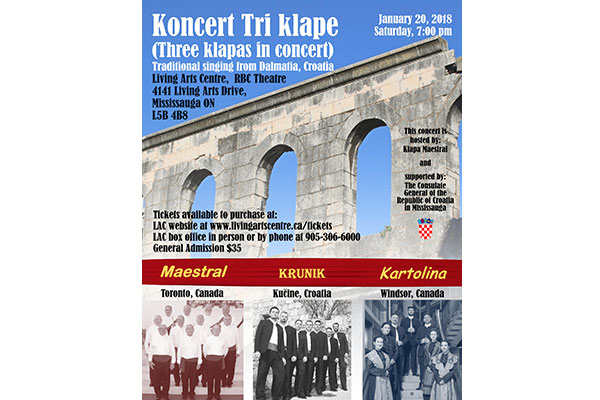 Prvi siječanjski koncert „Zvuk Dalmacije“ bit će održan u Umjetničkoj galeriji Windsor, potom Klapa Krunik nastupa u Torontu i Mississaugi a onda slijedi „Koncert tri klape“ u Torontu