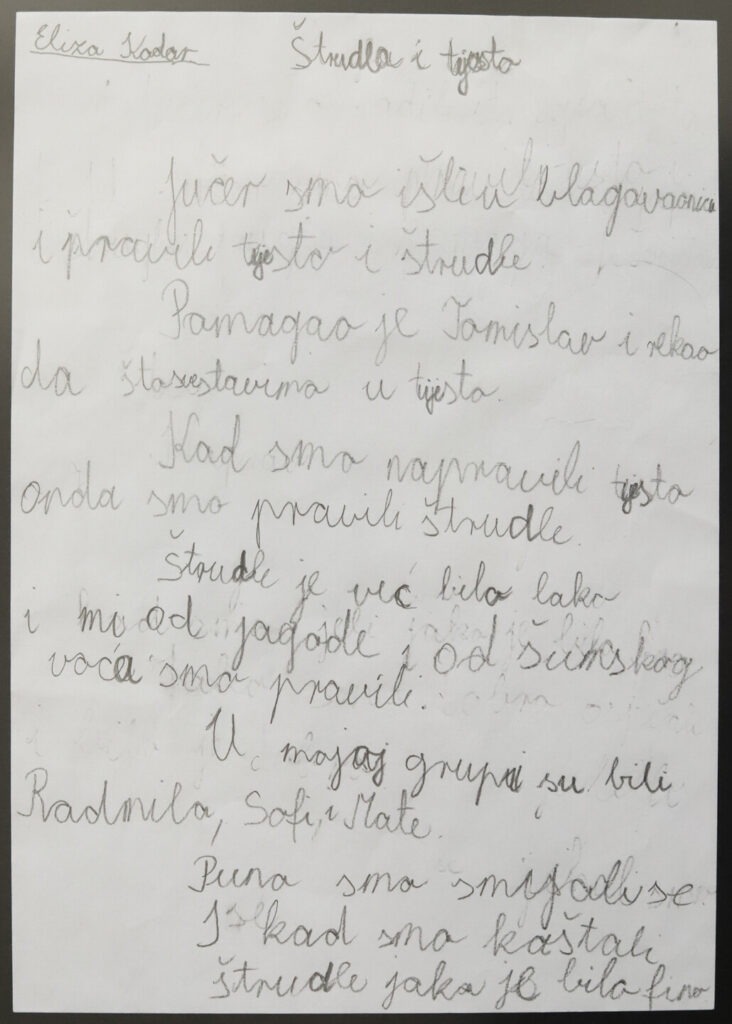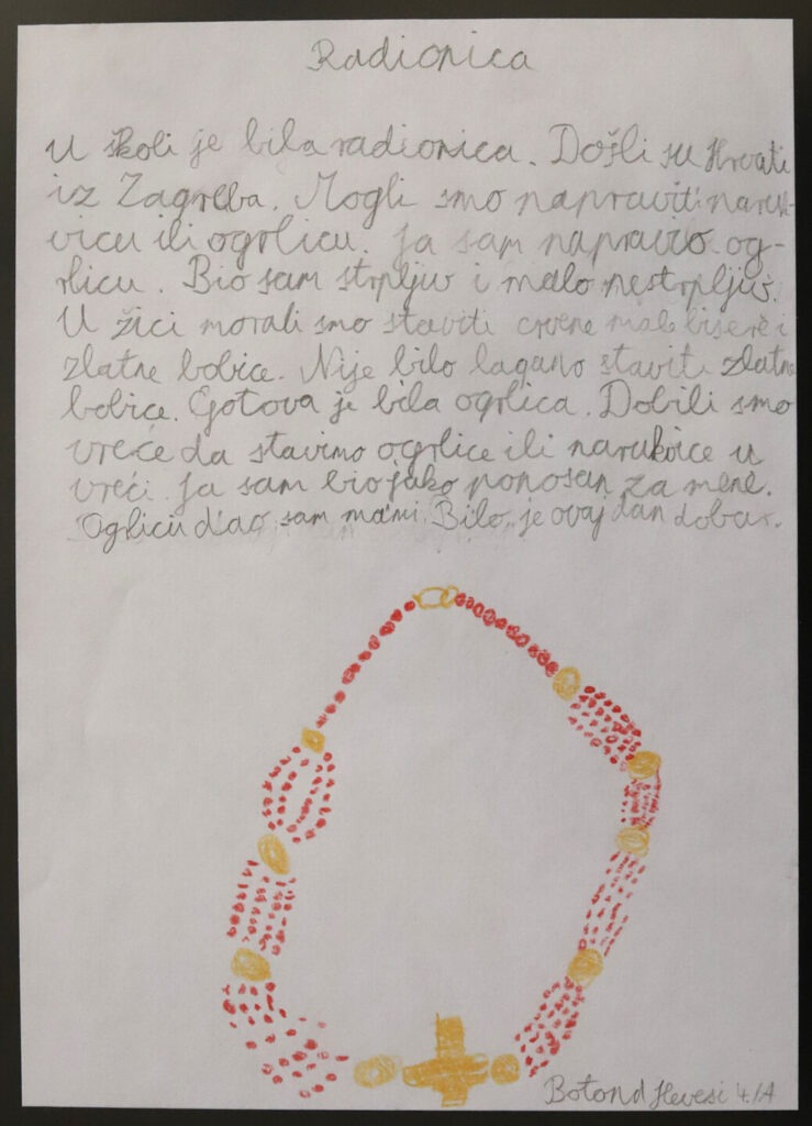 U jezično-likovnoj radionici su se učenici 1. i 2. razreda raznim likovnim tehnikama te jezičnim zadacima i aktivnostima upoznali s glagoljicom, 3. razredi su pripremili domaće rezance i štrudle s kojima su se po završetku radionice osladili, a 4. razredi su izradili tradicionalni mljetski kolarin te ga ponijeli na dar nekome od svojih milih. Sudjelujući u radionicama učitelji su mogli usvojiti nova znanja te dobiti ideje i poticaje za unaprjeđenje svoga rada. Program su provele Matičine djelatnice Sara Marđetko, Snježana Radoš i Lada Kanajet Šimić te Matičin suradnik Tomislav Jelić.