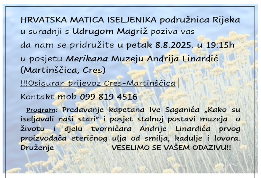 U  organizaciji Hrvatske matice iseljenika podružnica Rijeka  i u suradnji s Udrugom Magriž iz Martinščice na Cresu će se 8. kolovoza održati okupljanje hrvatskih iseljenika iz SAD-a