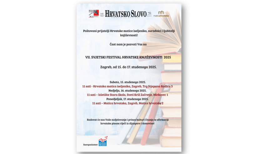 Čast nam je pozvati Vas na svečano otvorenje i radni dio sedmog Svjetskog festival hrvatske književnosti 2025., koji će se održati na dvije lokacije u Zagrebu te Svetom Križu Začretje od 15. do 17. studenoga 2025.