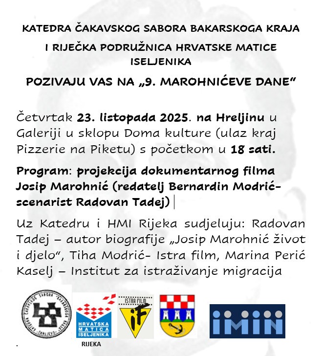 Hrvatska matica iselejnika Podružnica Rijeka i Katedra čakavskog bakarskoga kraja organiziraju 9. Marohnićeve dane na Hreljinu (Bakar) 23. listopada 2025. s početkom u 18 sati.