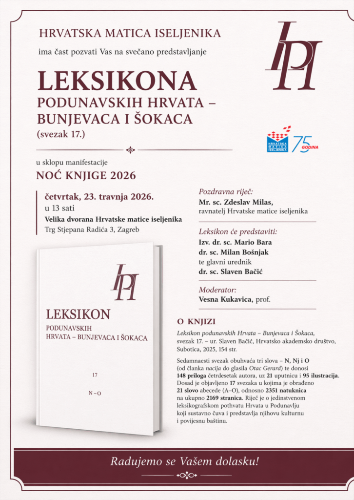 Posrijedi je jedinstven leksikografski pothvat Hrvata u Podunavlju prve četvrtine 21. stoljeća, nakladnika Hrvatskog akademskog društva iz Subotice (Vojvodina). Sedamnaesti svezak Leksikona, koji obuhvaća tri slova N, Nj i O (od članka nacija do glasila Otac Gerard) donosi natuknice koje je oblikovalo četrdesetak autora, napisavši ukupno 148 priloga, koje prati 21 uputnica i 95 ilustracija. Sažeto, dosad je objavljeno 17 svezaka u kojima je obrađeno 21 slovo abecede (A-O). Zanimljiva građa iz svih dosadašnjih 17 svezaka opseže čak 2169 stranica koje sadrže 2351 natuknicu. Specifičnost ovoga „Leksikona podunavskih Hrvata – Bunjevaca i Šokaca“, kao svojevrsnog regionalnoga leksikona, ogleda se u pristupu istraživanju i obradi biografijā koje se donekle razlikuju od biografskih uzusa leksikografske obrade na nacionalnoj razini. Čitatelji u ovom Leksikonu tako mogu otkriti kroz retke posvećene životnom putu pojedine uvrštene ličnosti na koji se način stvaralaštvo te osobe reflektira na predmetnu etničku povezanost sa zavičajnim sredinama podunavskih Hrvata, zemljopisno omeđenim međuriječjem Dunava i Tise. Eto razloga da i Vi za ovogodišnju Noć knjige znatiželjno provjerite možebitnu povezanost s Hrvatima u Podunavlju!