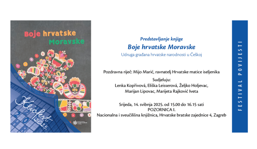 Pozivamo Vas u organizaciji Hrvatske matice iseljenika na svečano predstavljanje knjige, autorskog dvojca Lenke Kopřivove i Eliške Leisserove, pod naslovom „Boje hrvatske Moravske“, koje će se održati u Nacionalnoj i sveučilišnoj knjižnici u Zagrebu u ulici Hrvatske bratske zajednice 4, i to s početkom u 15 sati u srijedu 14. svibnja 2025., a u sklopu prestižnog Festivala povijesti Kliofesta.