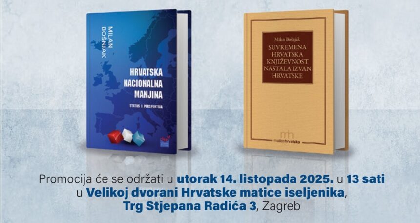 Hrvatska matica iseljenika i Matica hrvatska imaju čast pozvati Vas na svečanu promociju dvoknjižja pod naslovom „Suvremena hrvatska književnost nastala izvan Hrvatske“ (MH, 2024.) i „Hrvatska nacionalna manjina – status i perspektiva“ (HMI, 2024.) autora dr. sc. Milana Bošnjaka.