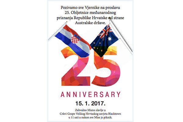 Hrvatska zajednica Blacktowna 15. će siječnja proslaviti 25. obljetnicu australskog priznanja Republike Hrvatske. Naime, Australija je službeno priznala Republiku Hrvatsku 16. siječnja 1992. godine u Hrvatskom katoličkom centru Blacktown u 11 sati će biti održana misa zahvalnica, nakon čega će se druženje nastaviti uz piknik.
