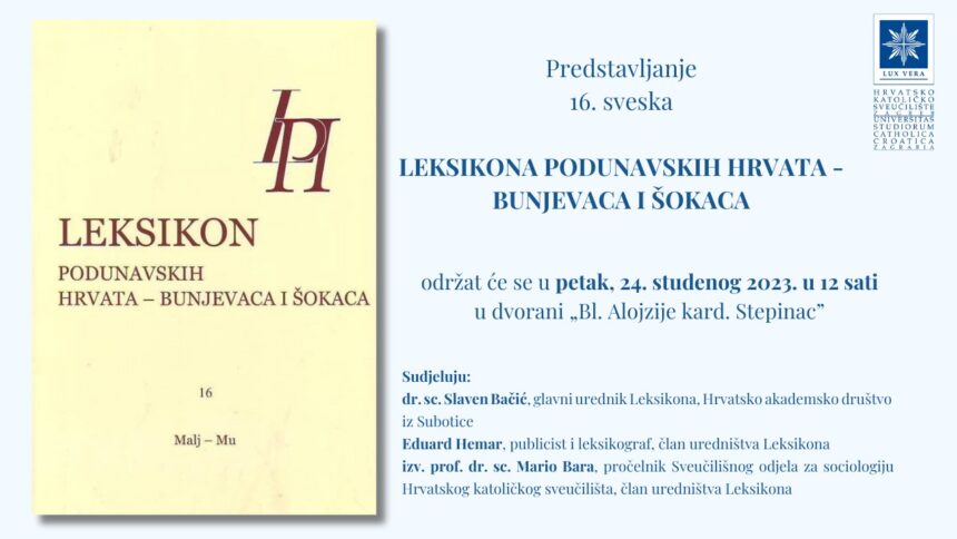 U petak 24. studenog 2023. u dvorani “Bl. Alojzije kard. Stepinac” u 12 sati na Hrvatskom katoličkom sveučilištu održat će se predstavljanje 16. sveska Leksikona podunavskih Hrvata – Bunjevaca i Šokaca. Riječ je o kapitalnom leksikografskom projektu hrvatske manjine u Vojvodini i Republici Srbiji.