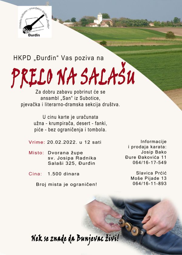 HKPD Đurđin organizira Prelo na salašu koje će biti održano u nedjelju, 20. veljače s početkom u 12 sati u župnoj dvorani u Đurđinu, na adresi Salaš 325. Cijena karte je 1.500 dinara, a u nju je uračunat ručak (krumpirača i fanki), neograničeno piće, tombola za sve goste te zabavni program u režiji pjevačke i literarno-dramske sekcije Društva. Za veselu atmosferu bit će zadužen ansambl San iz Subotice. Broj karata je ograničen te organizatori poručuju da zainteresirani nabave svoju kartu na vrijeme!