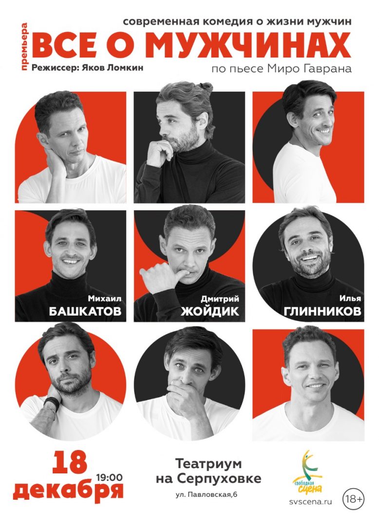 Komedija ‘Sve o muškarcima’ bit će premijerno izvedena u produkciji Teatra Svobodnaya scena. Prijevod teksta na ruski jezik načinio je Sergej Girin, redatelj je Jakov Lomkin, u glavnim ulogama nastupaju Mihail Baškatov, Dimitrij Žojdiki i Ilja Glinnkov