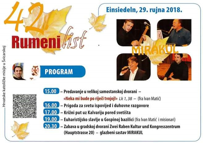 Hrvatske katoličke misije u Švicarskoj pozivaju na tradicionalan susret mladih, “Rumeni list” u Švicarskoj koji će se održati u Einsiedelnu u subotu, 29. rujna 2018. Ovogodišnje hodočašće predvodit će fra Ivan Matić, voditelj kuće Tabor u Samoboru.