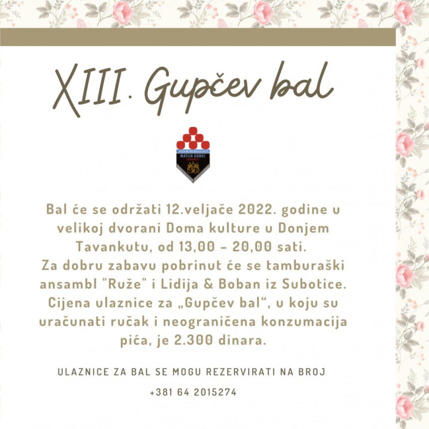 HKPD Matija Gubec https://web.facebook.com/hkpd.matijagubec/?_rdc=1&_rdr organizira 13. po redu Gupčev bal koji će biti održan 12. veljače 2022. godine, u vremenu od 13 do 20 sati. Za dobru zabavu u velikoj dvorani Doma kulture u Donjem Tavakutu pobrinut će se tamburaški ansambl Ruže i Lidija & Boban iz Subotice. Cijena ulaznice s uračunatim ručkom i neograničenom konzumacijom pića iznosi 2.300,00 dinara. Rezervacije na telefon +381642015274 (ZKVH)