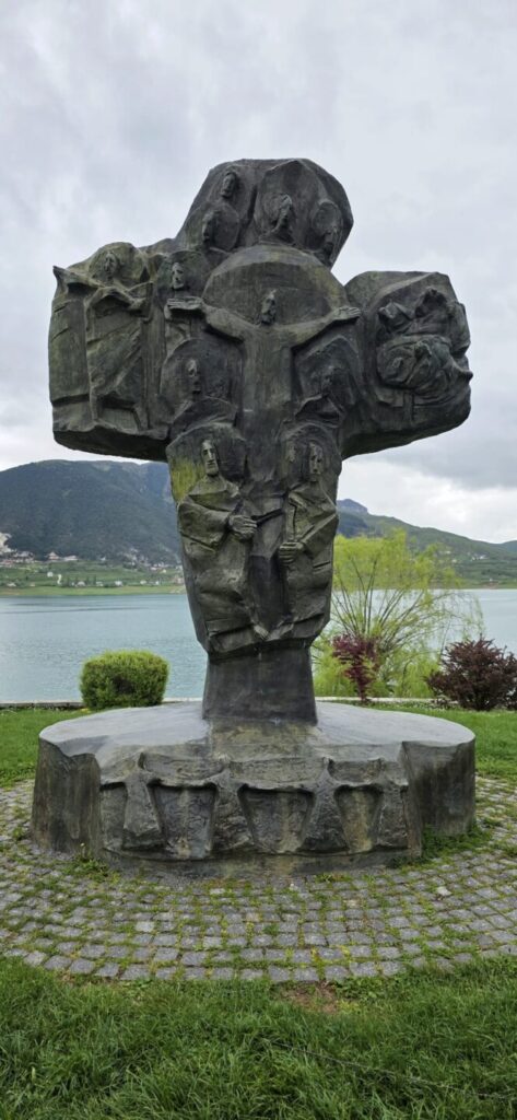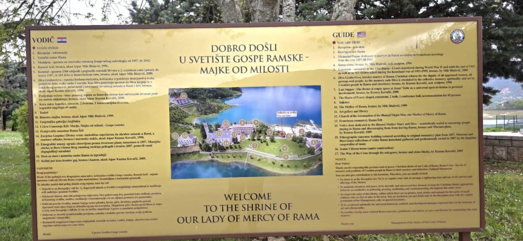 Nakon kulturnog predaha u Galeriji Gorica put nas je odveo dalje, put Ramskog kraja, prema Šćitu na Ramskom jezeru, gdje smo posjetili Franjevački samostan i muzej Rama-Šćit. Povijest ovoga kraja bila je ispisana ne samo u knjigama i artefaktima, nego i u očima franjevaca koji nas tamo dočekuju. U parku Franjevačkog samostana Rama-Šćit, smještenom na slikovitom poluotoku uz Ramsko jezero, posjetitelji mogu uživati u impresivnoj zbirci suvremenih skulptura koje svjedoče o bogatoj duhovnoj i kulturnoj baštini ramskog kraja. Skulptura Posljednja večera brončana je skulptura hrvatskoga akademskog kipara akademika Kuzme Kovačića, Zmaja Hvarskoga III., iz 2000. godine, dimenzija 170×308 cm. Kružna kompozicija prikazuje Isusa i dvanaest apostola u trenutku posljednje večere, nudeći suvremeni likovni izraz dubokog teološkog značenja. Ramski križ, impozantni je križ visine 4 metra i težine 2 tone, djelo Mile Blaževića, postavljen 1996. godine. Križ je spomenik svim stradalima u ratovima, a njegov monumentalni oblik i simbolika čine ga središnjim mjestom za molitvu i sjećanje. Diva Grabovčeva skulptura je posvećena legendi o djevojci Divi Grabovčevoj, simbolu čistoće i vjernosti, koja je postala važan dio lokalne tradicije i duhovnosti. O povijesti samostana te o strahovitom stradanju naroda ramskoga kraja, o čemu svjedoči ploča s imenima više od 800 pobijenih osoba nakon II. svjetskog rata kao i skoro 200 osoba poginulih u Domovinskom ratu, iscrpno nam je ispričao fra Mijo Đolan, bivši provincijal, a sada upravitelj Kuće mira i dio samostanskoga bratstva.
