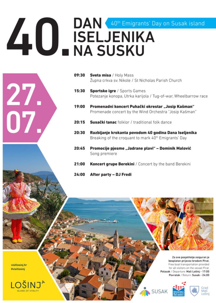 Uz promociju pjesme Suščana Dominika Malovića „Jadrane plavi“, nazočne iseljenika i turiste će razveseliti i susački tanac „Unaj do“ te promenadni koncert Puhačkog orkestra „Josip Kašman“. Vrhunac proslave je večernji nastup poznatog hrvatskog kantautora Olivera Jakovčeva „Berekina“ nakon čega zabavu nastavlja do kasnih noćnih ura DJ Fredi! Organizatori kulturno-zabavnog i sportskog programa obilježavanja jubilarnog Dana iseljenika otoka Suska su Grad Mali Lošinj, Hrvatska matica iseljenika – podružnica Rijeka, Mjesni odbor Susak te Turistička zajednica Grada Malog Lošinja, kao upravnoga središta te otočne sredine. Organizatori ističu kako je za sve posjetitelje organiziran besplatan prijevoz izletničkim brodom „Pirat“ iz malološinjske luke u 17 sati, a povratak sa Suska bit će u ponoć.