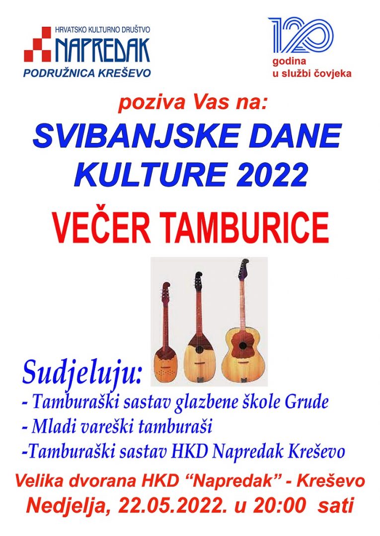 U okviru kulturne manifestacije “Svibanjski dani kulture 2022.”, HKD Napredak podružnica Kreševo organizira “Večer tamburice” koja će biti upriličena u nedjelju, 22. svibnja 2022. godine, u 20,00 sati u velikoj dvorani HKD Napredak u Kreševu.